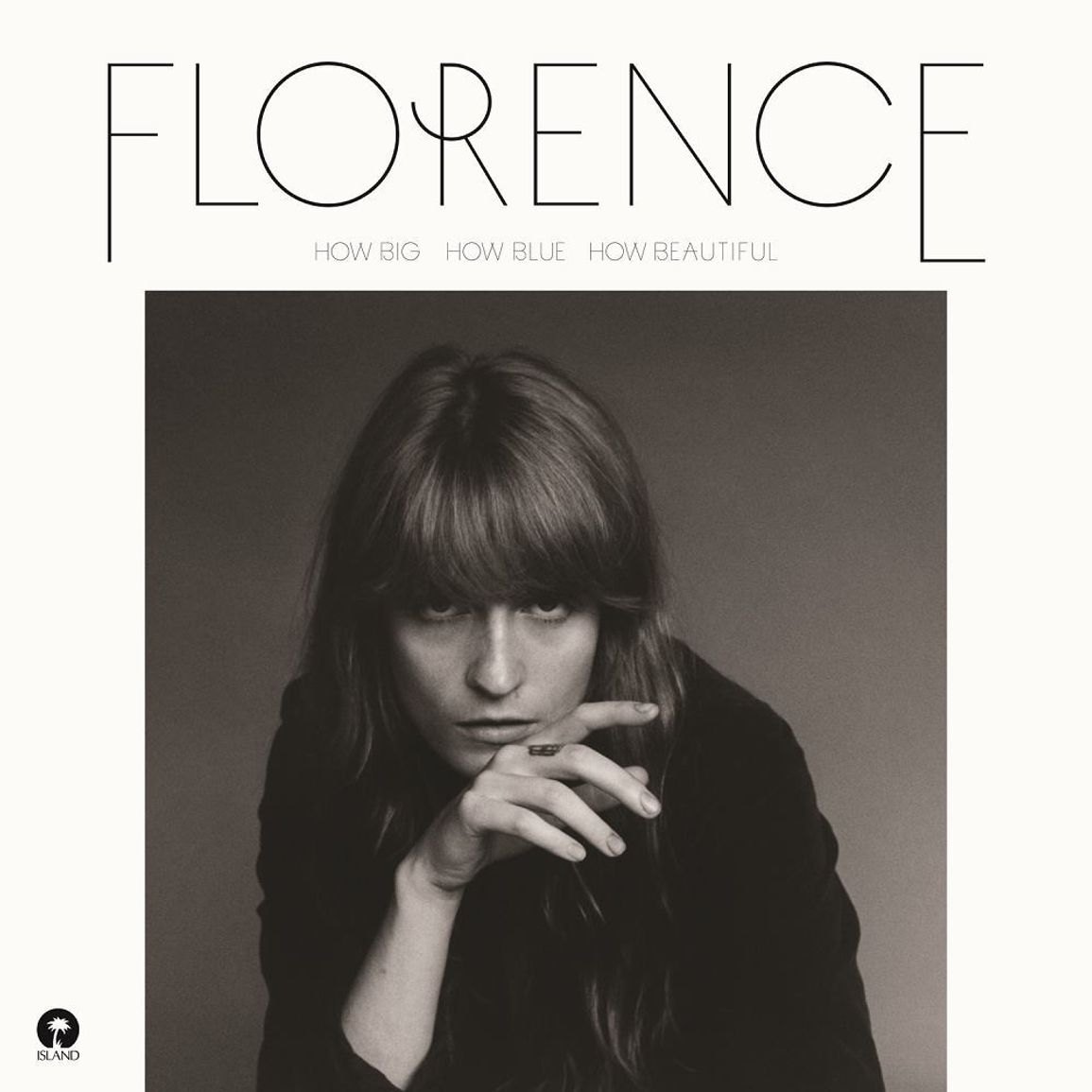 Schwarzweißporträt von Florence Welch, die mit ernstem Blick und gestütztem Kinn direkt in die Kamera schaut; minimalistisches, typografisch klares Cover mit dem Schriftzug „Florence – How Big, How Blue, How Beautiful“.